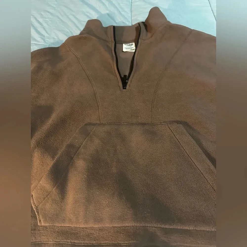 1/4 zip closure, cozy fleece fabric, front pocket, adjustable drawstring hem. Measurements laying d... Show more