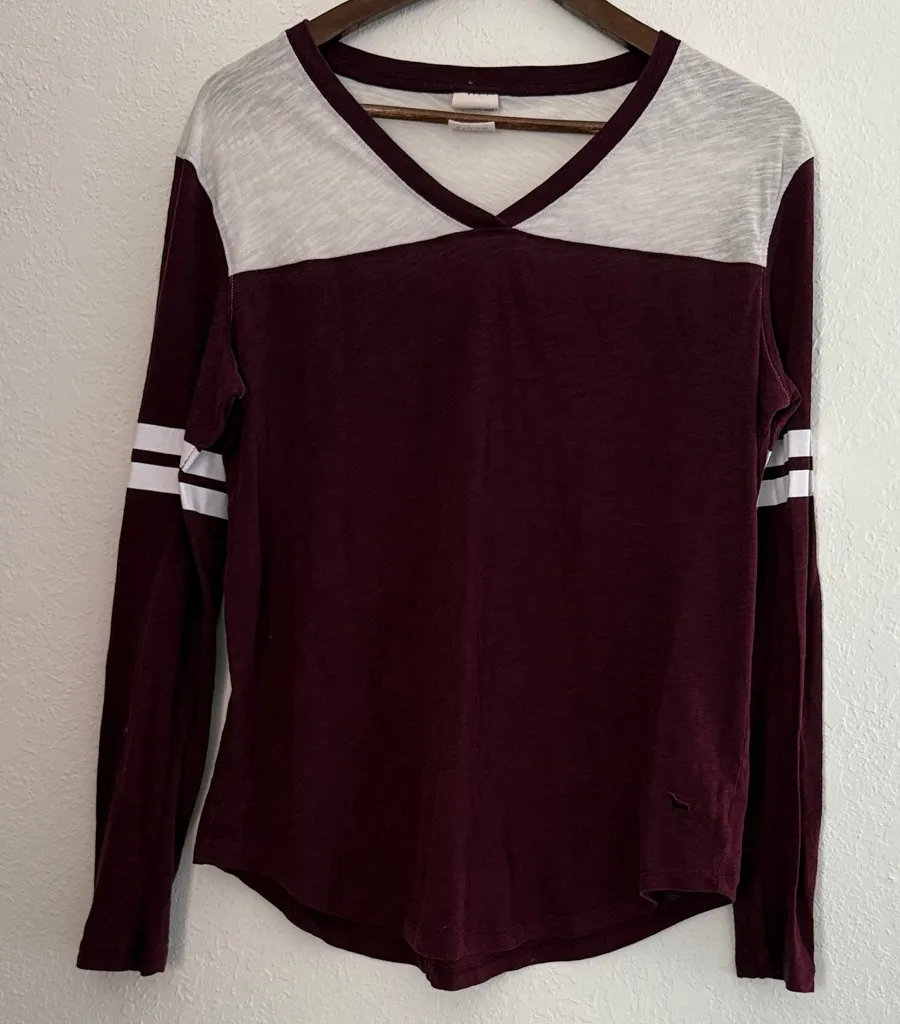 This PINK Victoria’s Secret long sleeve tee features a burgundy body with bold white stripes on the... Show more