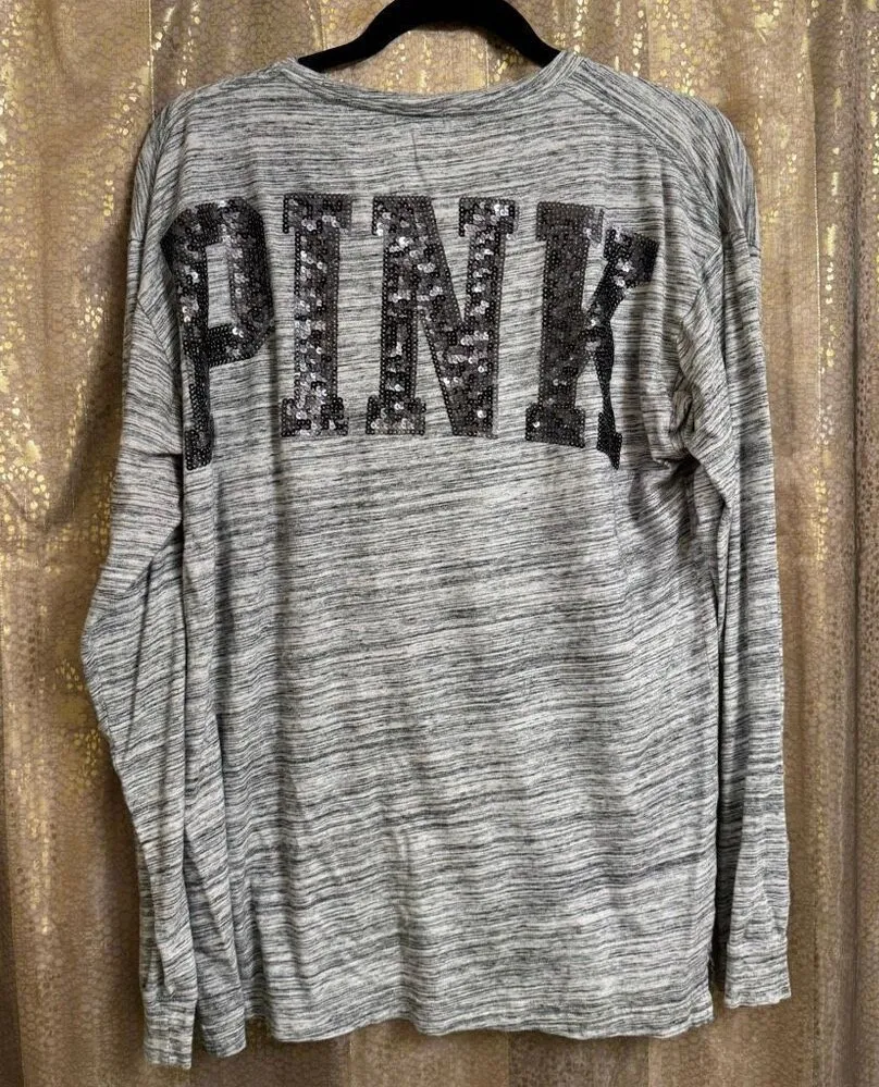 PINK Victorias Secret Gray Bling Sequined Shoulder Logo Campus Top Large Great very gently used co... Show more
