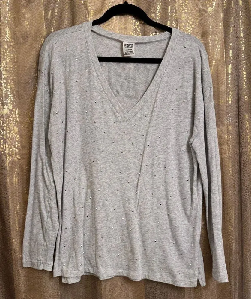 PINK Victorias Secret Gray Studded Rhinestone Glitter Logo V Neck Top Large Great very gently used... Show more
