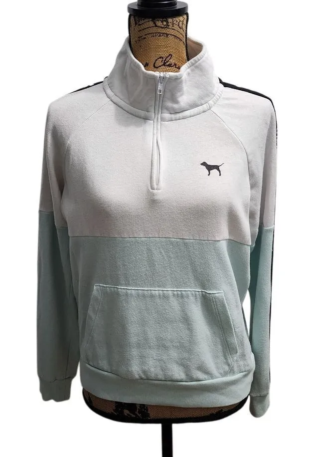 Keywords: half zip, color block, dog logo, mint green, white, pullover, sweatshirt, kangaroo pocket, PINK brand, athletic wear, loungewear, tape detail, casual
