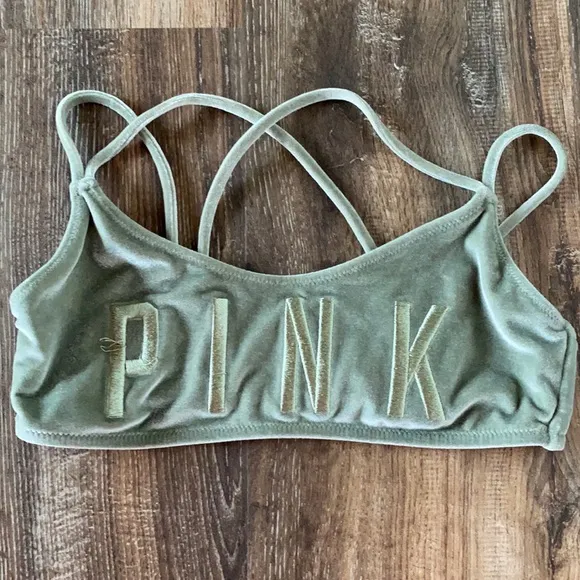 Logo scoop bikini top from PINK Victoria’s Secret. Olive green velvet top, lined. Stitched logo on t... Show more