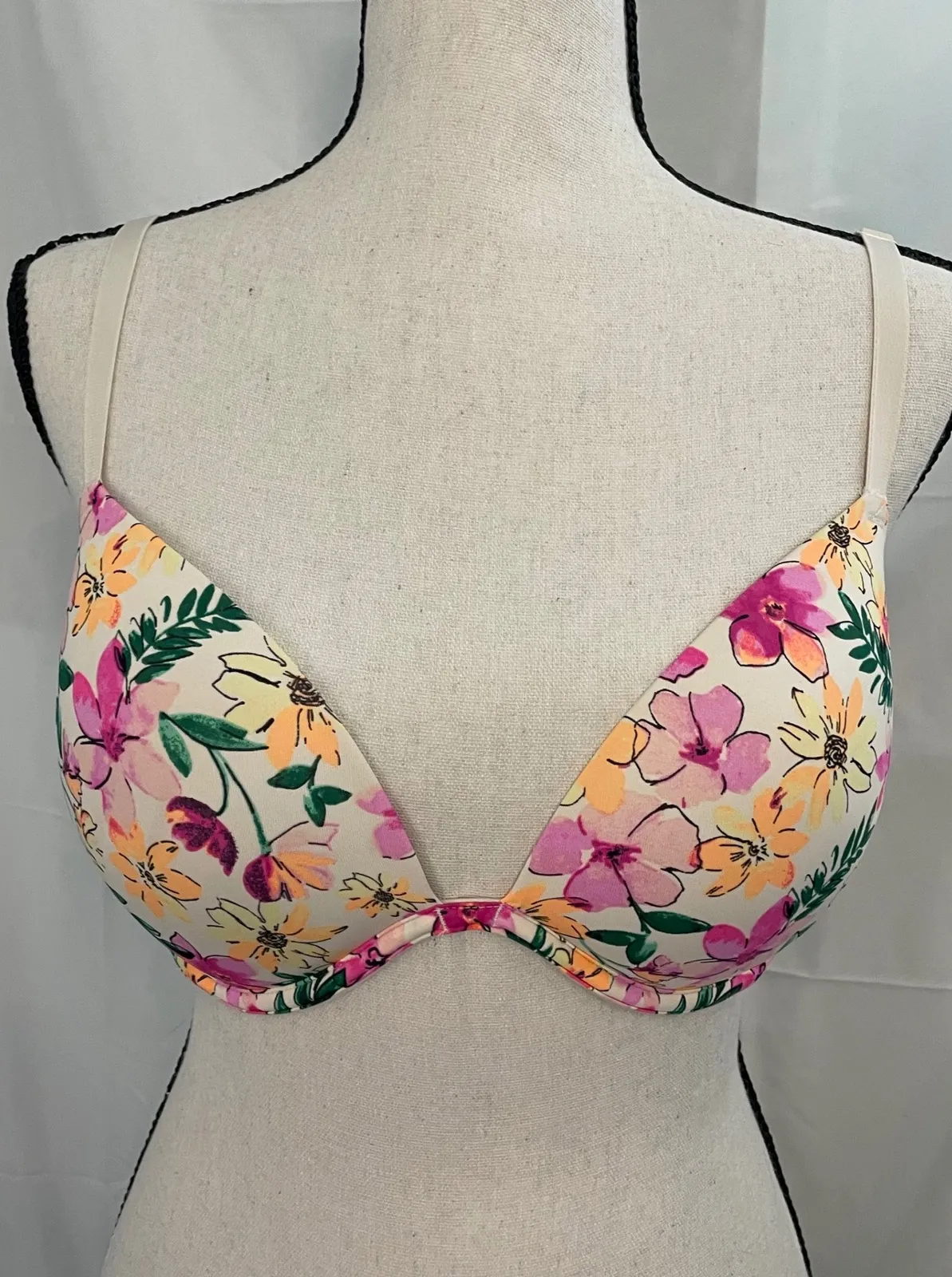 Charming floral bra from PINK Victoria's Secret, designed to elevate your everyday style. Featuring a vibrant floral print in shades of pink, yellow, and green against a neutral backdrop, this bra adds a touch of whimsy to your lingerie collection. The wear everywhere super push-up style offers excellent support and lift for a flattering silhouette.