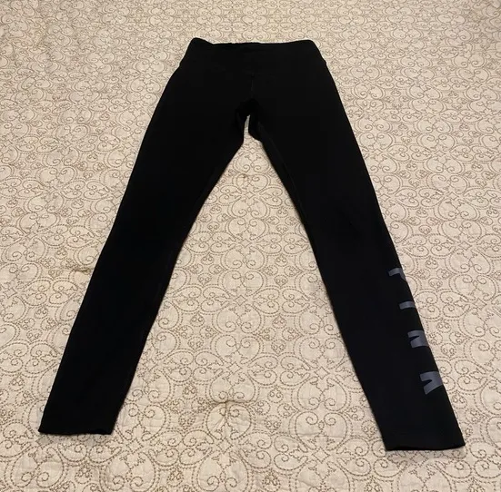 . Sleek black leggings with logo detail. Material does have a little fuzziness from washing as shown... Show more