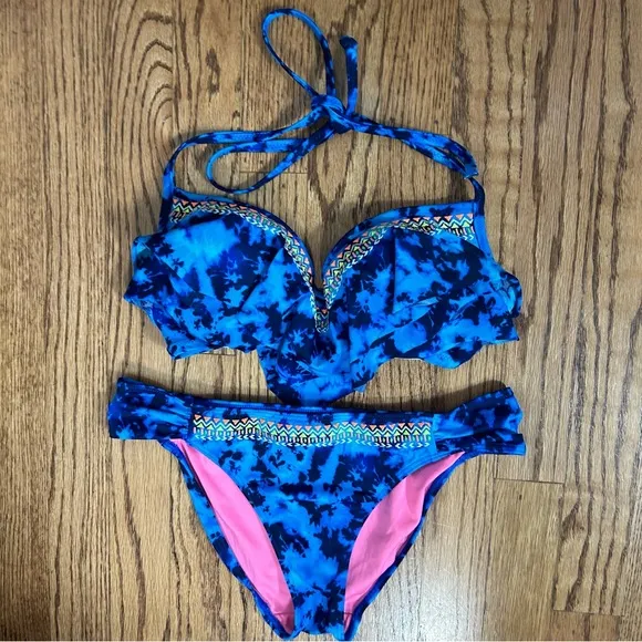 Size S PINK Victorias Secret Two Piece Bikini Layered Ruffle Top Adjustable Back & String Neon T... Show more