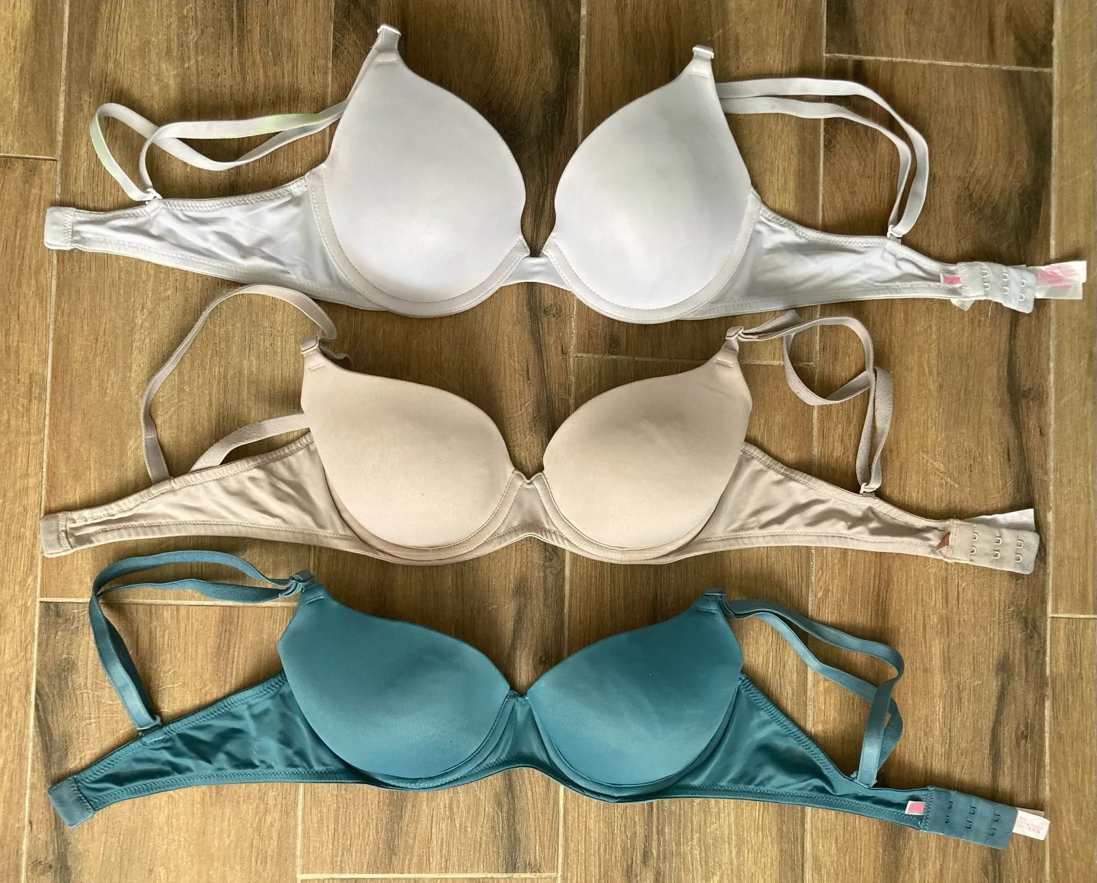 PINK Wear Everywhere lightly lined bras in size 32B. Colors are white, beige, and teal. All bras a... Show more