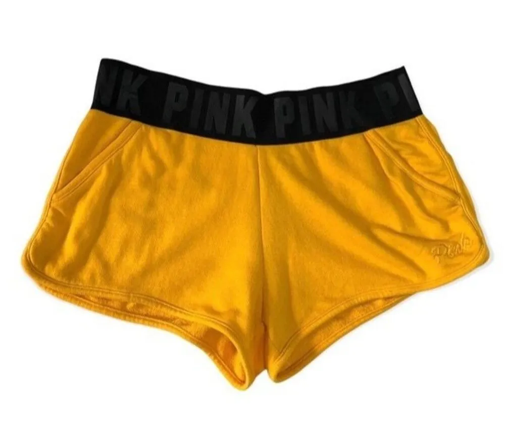 Features: PINK Logo Banded Waistband Side Pockets Yellow & Black Stretch Fabric: 60% Cotton 40% Pol... Show more