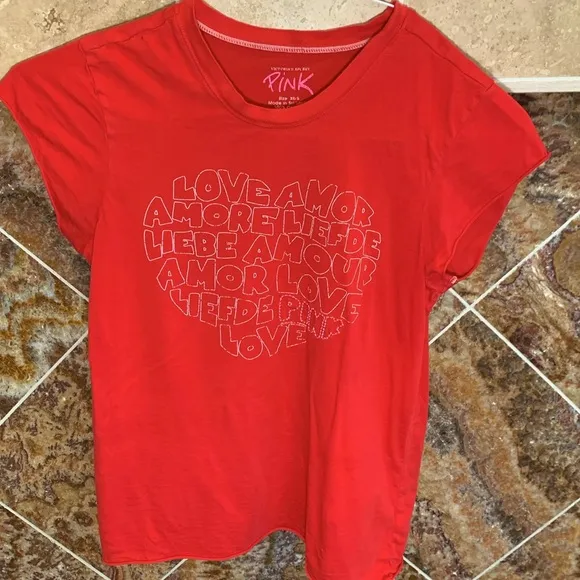 Red shirt with White Heart Word Design on Front Design is made love words Flaws: a few small holes n... Show more