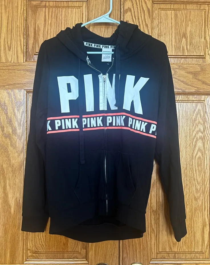 Cozy black hoodie with white 'PINK' logo. Features zip-up front and drawstring hood. Size S-P, can... Show more