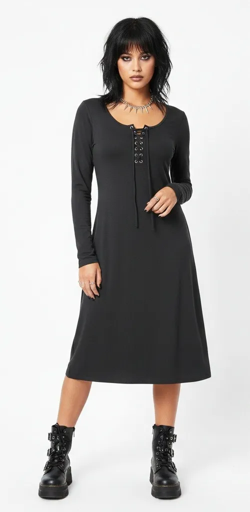 Lace-up front accent Pull-on style V-neckline Long sleeve Midi length A-line silhouette Relaxed fit Soft knit fabric Stretch Solid pattern Lightweight drape Comfortable everyday wear Gothic Dark Academia Witchy Grunge Alternative Indie Event Going Out Fall Winter Approx. Measurements: Pit to pit: 18" Sleeve length: 24.5" Length: 38"