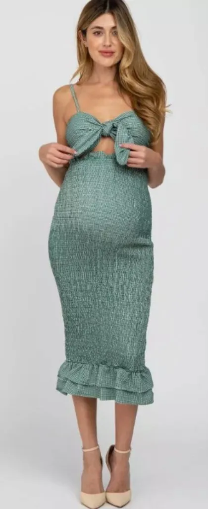 . Step into effortless style with our Gingham Print Smocked Fitted Self-Tie Maternity Midi Dress. De... Show more