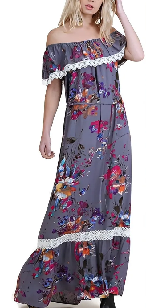Pink Blush Resortwear Vacay Boho Lace Crochet Off Shoulder Floral Maxi Dress in Gray and Pink. Size Small. Good preowned condition. Missing the waist tie (see photos). - Lace Crochet Trim - Off Shoulder - A-Line - Maxi Length - 65% Cotton, 35% Polyester Tags- Maternity Photos Summer Spring Resort Wear Vacation Approximate Measurements While Laying Flat: Pit To Pit: 16.5" Length: 52" All Items Come From A Smoke Free Home ! All Reasonable Offers Welcome !