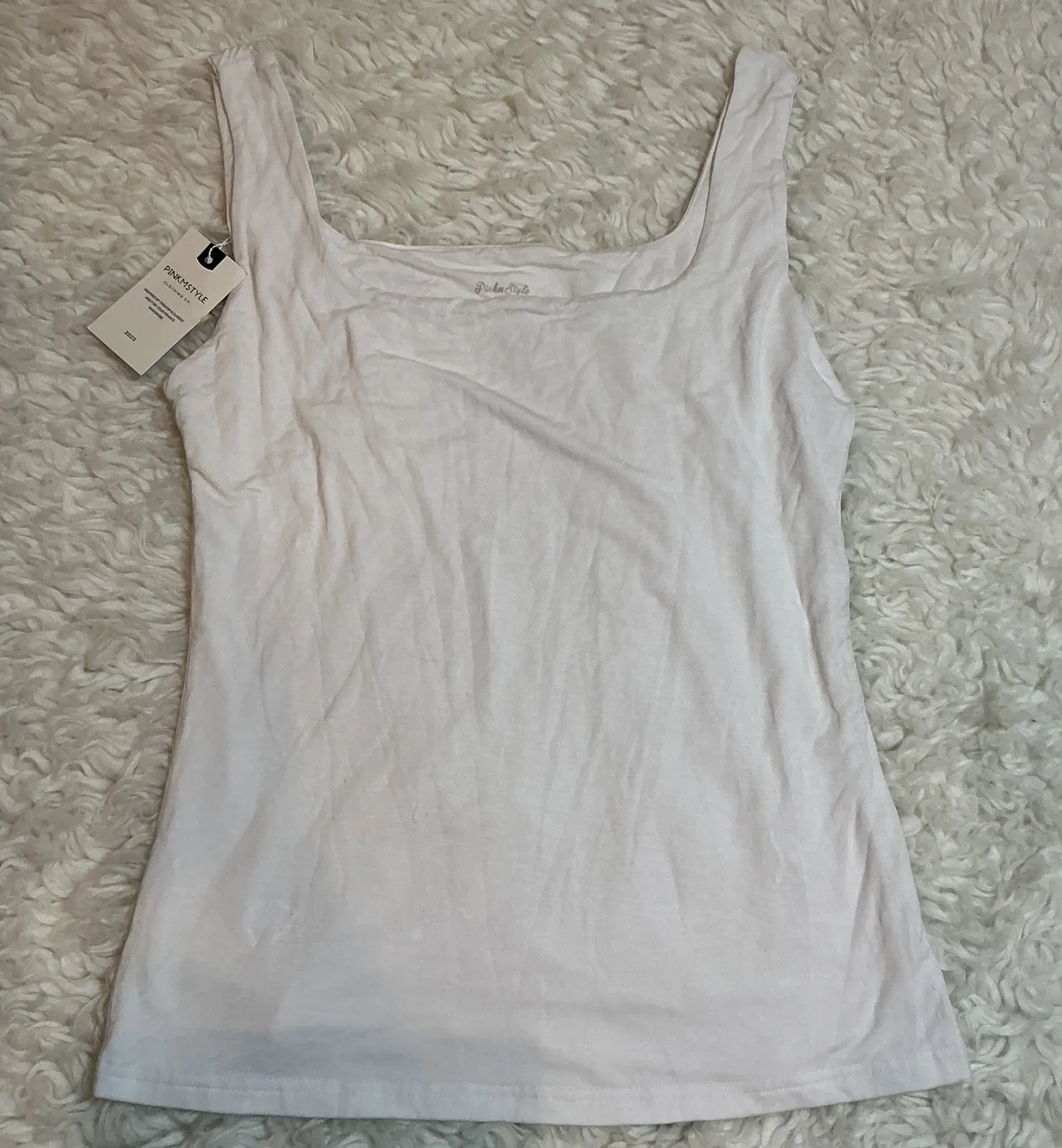 Discover everyday comfort and style with this Pinkmstyle Clothing Co tank top. Its flattering square neckline offers a modern silhouette perfect for layering or wearing solo. The soft fabric drapes beautifully, promising a comfortable fit that moves with you. Ideal for casual outings, lounging at home, or as a foundational piece for your daily wardrobe. Type: Tank Department: Women Style: Basic Neckline: Square Neck Sleeve Length: Sleeveless Sleeve Type: Strappy Sleeve Pattern: Solid Theme: Classic Features: Stretch, Easy Care Fit: Classic Fabric Type: Jersey Occasion: Casual Closure: Pullover Season: Spring, Summer, Fall Strap Type: Wide Strap Keywords: Pinkmstyle, tank top, white, square neck, basic, essential, layering, women's, comfort, casual, versatile, everyday, solid, sleeveless