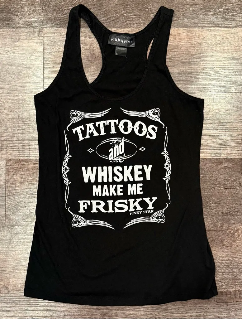 Black and white graphic tank top from Pinky Star. Says “ tattoos and whiskey make me frisky”. Size... Show more