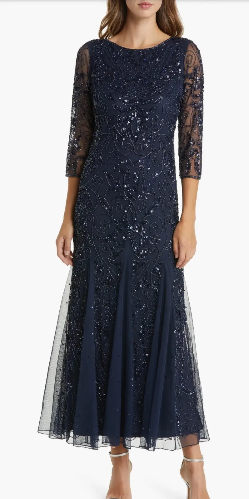 An exquisite navy beaded gown cascades with shimmering sequins and intricate swirling patterns, ready to make you the radiant star of any event. Its delicate mesh sleeves offer a touch of ethereal elegance, while the flowing skirt moves with graceful allure. Imagine yourself capturing every gaze at a sophisticated wedding reception, a glamorous gala, or a special anniversary celebration, feeling utterly breathtaking. Measurements: • Bust: 22 in • Waist: 21 • Hips: 30 • Length from shoulder to hem: 56 in • Sleeve length: 17 in Style: A-Line, Maxi Dress Length: Long Department: Women Sleeve Length: 3/4 Sleeve Pattern: Paisley Occasion: Formal, Wedding, Party/Cocktail Material: Rayon, Polyester Fabric Type: Mesh Theme: Flower Neckline: Boat Neck Season: Spring, Winter, Fall, Summer Sleeve Type: Cap Sleeve Closure: Zip Keywords: Pisarro Nights dress, beaded gown, sequin dress, navy formal dress, evening gown, mother of the bride dress, wedding guest dress, special occasion dress, 3/4 sleeve dress, elegant dress, glamorous gown, party dress, cocktail dress, designer dress
