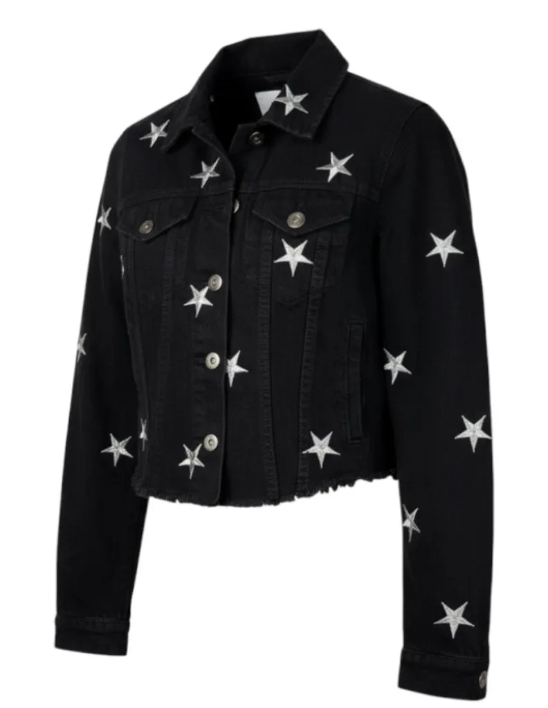 PISTOLA Brando star‑embroidered denim jacket S – black raw hem, silver stars - Brand/Style: PISTOLA ‘Brando’ denim jacket with allover star embroidery - Size: Women’s Small - Measurements: Pit to Pit ~17.5", Length ~17", Sleeve ~23.5" - Color: Black with silver embroidered stars - Fabric: 100% cotton denim; unlined - Features: cropped fit, raw frayed hem, button front, chest pockets, star sleeves - Condition: Excellent preowned; minimal wear - Occasions: concerts, weekend, game day, casual nights - Style ideas: pair with a white tee + straight jeans for model‑off‑duty; toss over a slip dress + boots for concert season - Style tags: star jacket, festival, cropped denim, edgy, black jean jacket