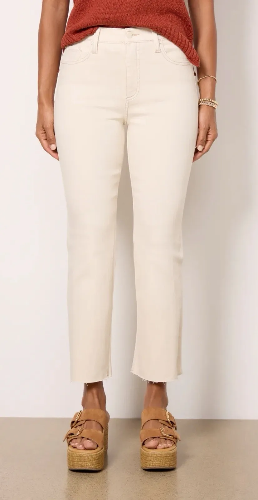 Crafted from soft stretch denim in an ecru wash, the Lennon jean by Pistola features a bootcut silhouette with a high-rise waist and ankle-length raw hems. Take them from day to night with a blouse, tee, or fitted tank! Details: * Sandstone ecru color way * High rise * Zipper fly * Cropped length * Raw hem * Fabric contents: 67% Cotton, 9% Rayon, 22% Recycled Polyester, 2% Elastane. * Excellent condition * Size 27 Approximate Measurements: * Rise-11” * Waist-14” * Inseam-24”