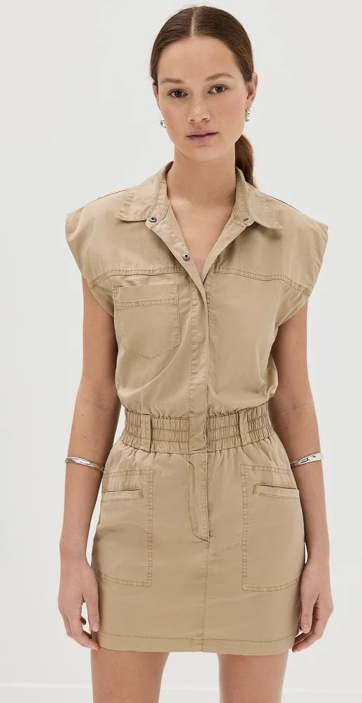 Style Name: Pistola Rosie Mini Dress Print: Coconut tan Features: Midweight stretch poplin, elasticized waist, padded shoulders, chest pocket & front and back pockets Closure: Snap Fabric: Cotton, spandex Size & Condition: Size Small, in excellent preowned condition no flaws. //Approx Measurements// Bust (laying flat): 20” Waist (flat, unstretched): 13” Length: 35”