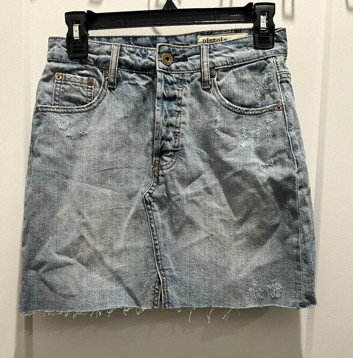 This Pistola skirt is a stylish mini denim skirt in a solid blue color with a distressed and frayed hem, giving it a casual and edgy look. The skirt features a zip closure and has a mid-rise fit, suitable for a party, casual outing, or even travel. Designed with American and city themes in mind, this 90s-inspired skirt is adorned with button and zipper accents, and comes in a size XS with pockets for added functionality. Made of cotton denim fabric, this skirt by Pistola is a versatile and trendy addition to any woman's wardrobe.