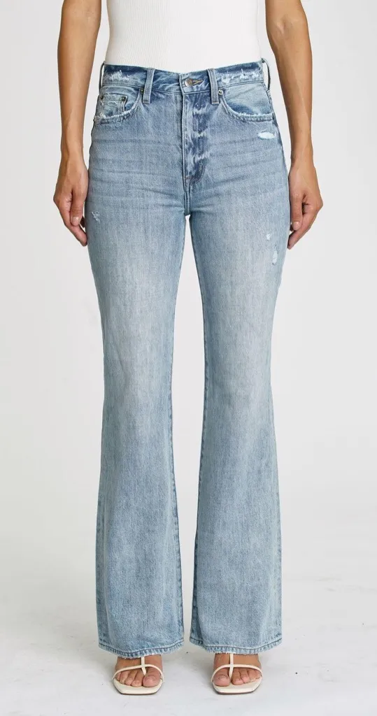 High rise relaxed flare jean. Button and zipper fly. Five pocket construction. Light distressing. Mi... Show more