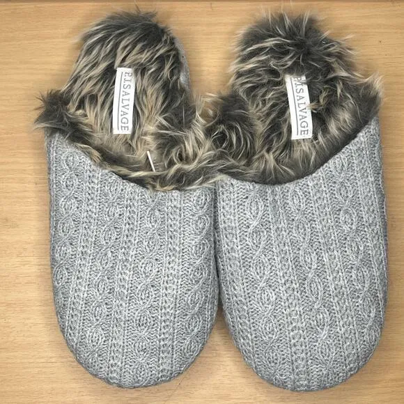 P.J. Salvage Women's Cable Knitted Slip on House Slippers Gray Faux Fur Lined NWOT Size M/L Measurem... Show more