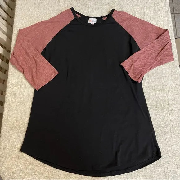 Pre-Owned LuLaRoe Top in a size XL. Black with pink/mauve glitter sleeves. It’s hard to see the spar... Show more