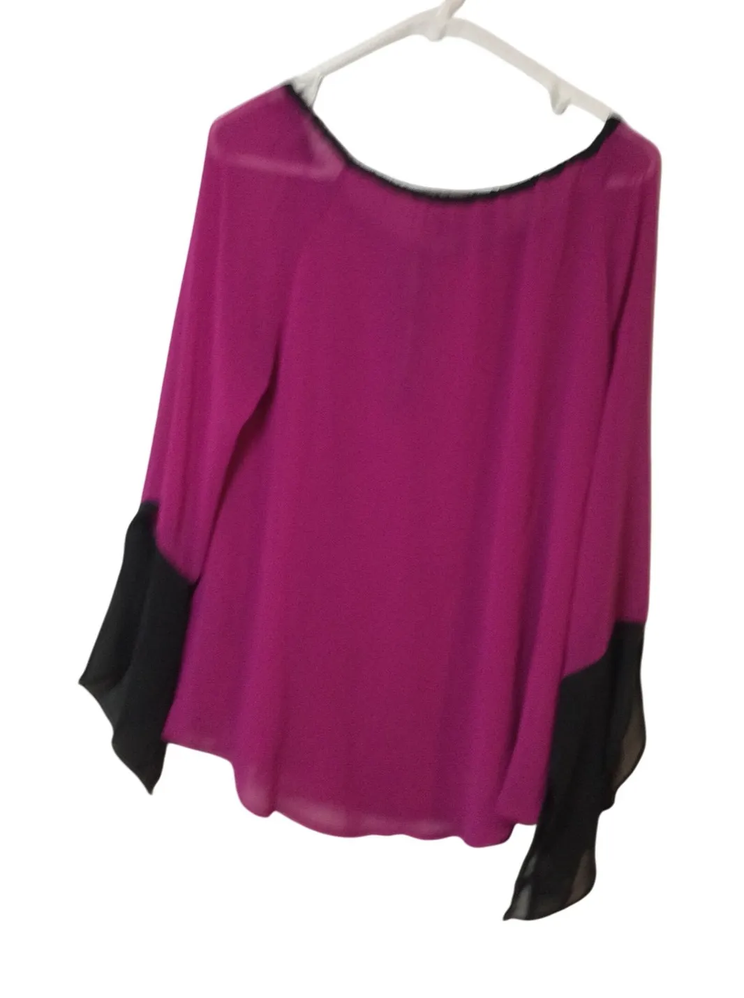 Elevated elegance arrives with this stunning tunic blouse. A captivating magenta hue is beautifully contrasted by chic black trim, creating a sophisticated and eye-catching look. The flowy silhouette drapes gracefully, offering both comfort and style, while the long sleeves add a touch of refinement. A delicate tie neck detail adds a charming focal point, allowing for versatile styling options. Perfect for a polished office ensemble or a chic evening out, this blouse effortlessly transitions from day to night. Imagine wearing it to a sophisticated dinner party or a stylish brunch with friends. Color: Purple Type: Blouse Department: Women Style: Tunic Material: Polyester Neckline: Round Neck Sleeve Length: Long Sleeve Sleeve Type: Classic/Fitted Sleeve Accents: Bow, Tie Pattern: Solid Features: Flowy, Sheer, Lightweight, Tie Neck, Long Sleeve Fit: Regular Keywords: jjill, tunic blouse, magenta top, black trim, long sleeve blouse, flowy top, tie neck blouse, womens blouse, size medium, dressy blouse, casual blouse, work blouse, career wear, boho blouse