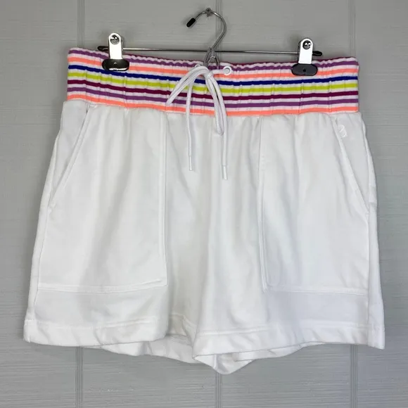 Lou & Grey white sweat shorts with a colorful stripped waistband. Drawstring closure. Very soft and... Show more