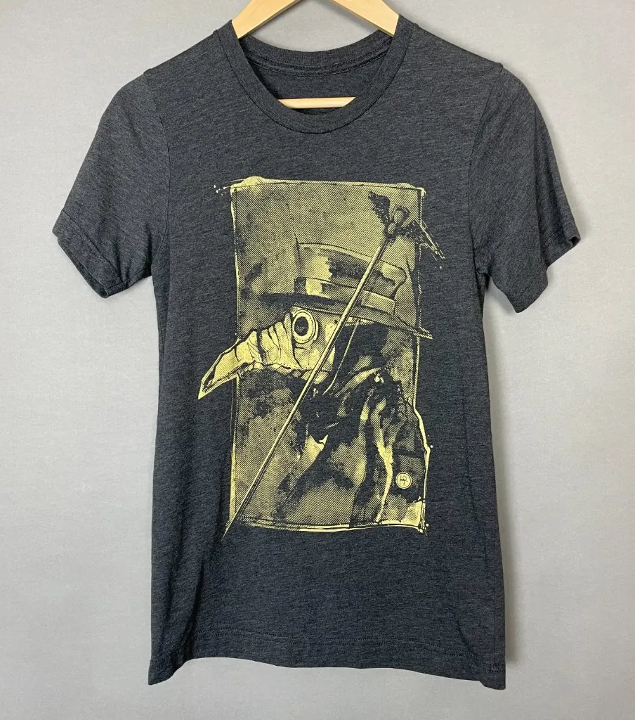 Gray graphic t-shirt with image of a plague doctor wearing their beaked mask. No brand, size, or materials info. Condition: Gently preloved, no holes or stains. No brand, size, or materials info. Size: No size tag. Estimating to fit as a women's size XS. See approximate measurements for best fit. Pit to pit: 15.5" Length: 25.5" Cleaned and from a smoke-free home. Fast shipper!