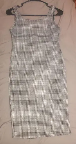 Cute gray (with black and white) plaid dress. It’s in perfect condition, I only wore it twice. This dress hugs your curves and accentuates the waist area. There’s a slit in the back. The material is stretchy so it would fit a small or medium. Fits true to size.