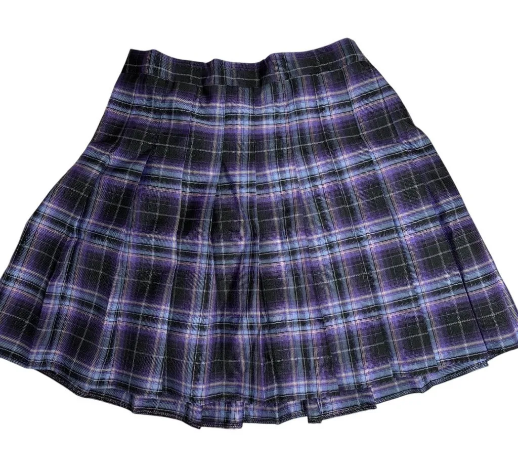 • Elastic waistband for adjustable fit • Built-in black shorts for added coverage • Lightweight and flowy pleated design • Purple and black plaid pattern Excellent condition No visible flaws or damage Waist: 14" laid flat, unstretched Length: 18.5" waist to hem No size or fabric tags