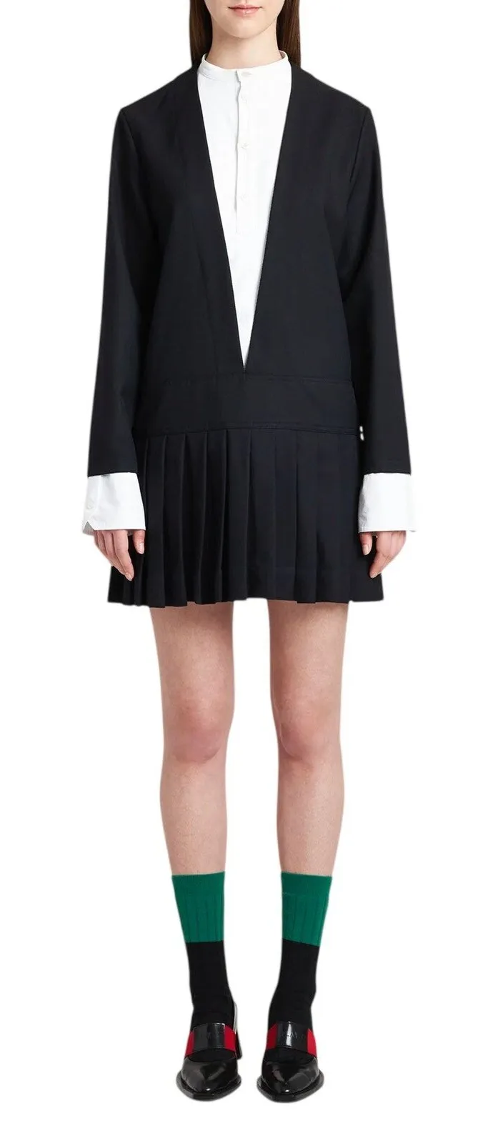 PLAN C Wednesday Button-Front Short Dress with Pleating Size 10 / French 44 MSRP $1,370 Give scholastic aesthetic a work-ready feel in this adorable one-and-done pleated dress by Plan C. Finish your look with knee-high socks and platform loafers to slay your work uniform or your luxury Jenna Ortega cosplay Black cotton (73% Wool woven, 27% cotton woven) Shift Long sleeves Collar Imported Approximate measurements P2P 21” Waist 19” 34" from shoulder to hemline