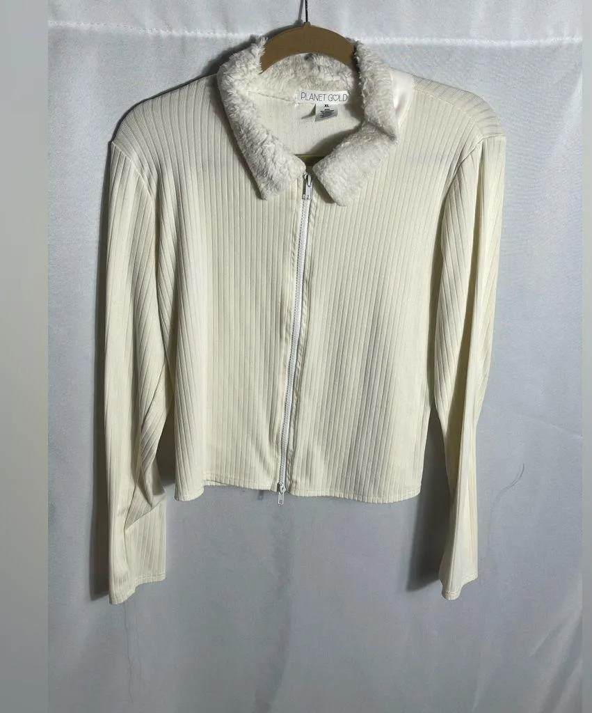 Chic and cozy Planet Gold ribbed knit zip-up top with a soft faux fur collar. Features long sleeves, vertical ribbed texture for a flattering fit, and cropped length with front zipper closure. The faux fur collar adds a stylish, Y2K-inspired touch — perfect for layering or wearing on its own. • Brand: Planet Gold • Size: XL (see measurements) • Color: Ivory / Cream • Material: Body – 92% Polyester, 8% Spandex | Faux Fur – 100% Polyester • Measurements (approx): • Chest (pit to pit): 18.5” • Length (shoulder to hem): 20.5” • Sleeve length: 21” • Condition: Excellent pre-owned condition, no flaws noted. Style Tags : Y2K, Cozy, Edgy Hashtags: #PlanetGold #FauxFurCollar #Y2KStyle #WinterChic #RetroVibes