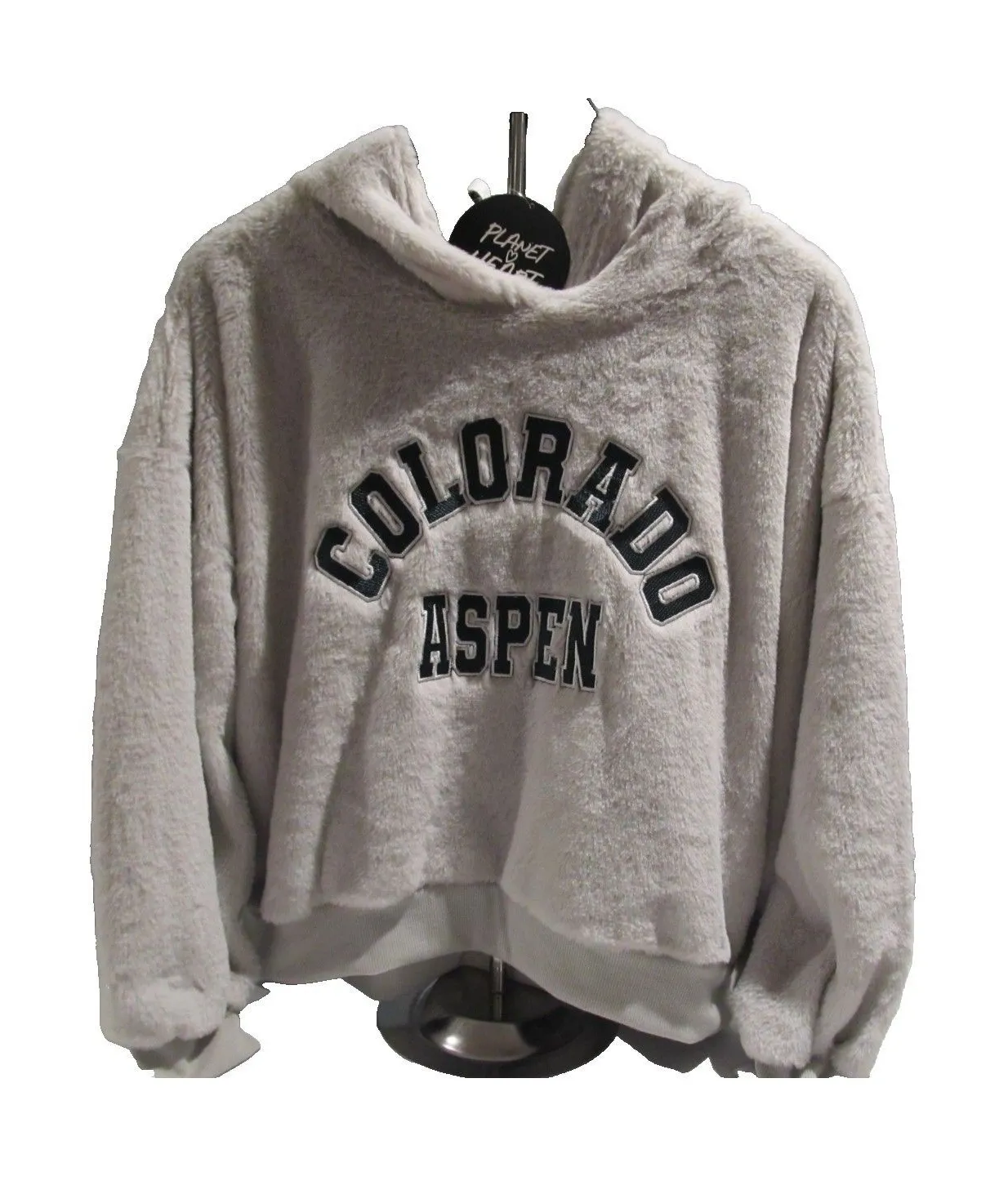 Planet Heart Fuzzy Hoodie Size XL Gray Colorado Aspen Graphic NWT Wrap yourself in cozy comfort with this Planet Heart fuzzy hoodie, featuring plush sherpa-style fabric and bold COLORADO ASPEN embroidery. Perfect for chilly days, this pullover delivers warmth and style with a relaxed fit and soft texture. ITEM DETAILS * Brand: Planet Heart * Style: Fuzzy Pullover Hoodie * Size: Junior XL * Color: Light Gray * Material: Polyester (soft sherpa fleece) * Graphic: COLORADO ASPEN in Green (Hunter)/Silver Embroidery Features: * Drawstring hood * Kangaroo front pocket * Ribbed cuffs and hem * Cozy plush texture Condition: New with Tags (NWT) Department: Juniors / Womens Occasion: Casual / Lounge / Streetwear FLAT LAY MEASUREMENTS (SIZE XL) Measured flat across, unstretched. Approximate. * Bust (pit to pit): 23" * Length (shoulder to hem): 25" * Sleeve length (shoulder seam to cuff): 24" * Shoulder width (seam to seam): 18" * Hem width: 22" WHY BUYERS LOVE IT * Ultra-soft fuzzy texture for warmth * Eye-catching Colorado Aspen graphic * Great for layering in cooler weather