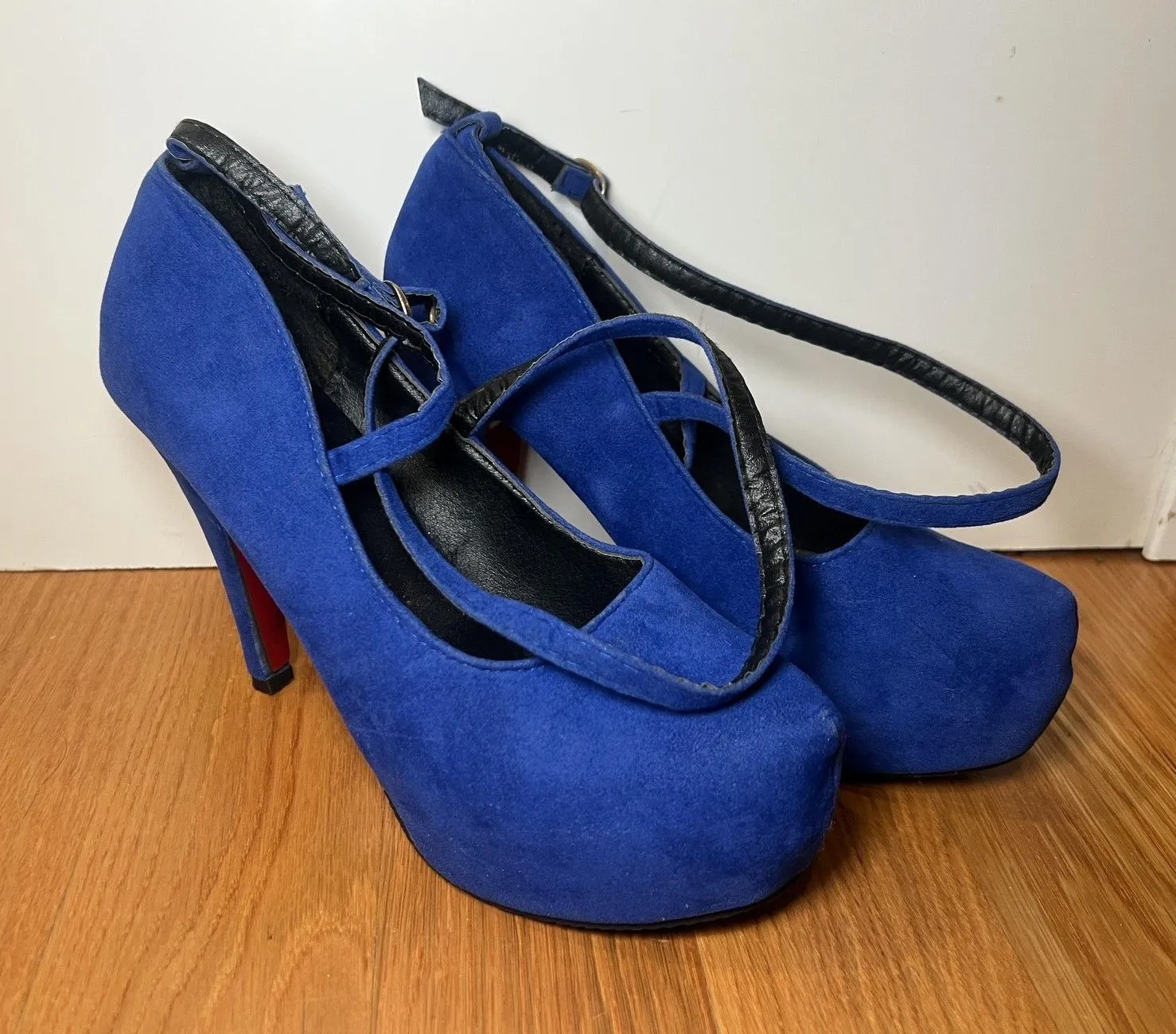 Lightly worn with small scuffs at toes and minor marks on uppers. Outsoles show wear; heel tips worn but intact. Straps and buckles function properly; no box. Item: Womens platform Mary Jane high heel pumps with crisscross vamp and ankle buckle strap. Color: Royal blue upper with black lining and red soles featuring black rubber traction pads. Material: Suede upper; outsole stamped "VERO CUOIO" indicating leather sole. Size: Marked "250"; fits approximately US Womens Size 8 (compare to your preferred size chart). Branding/Markings: Sole shows "VERO CUOIO" and "250"; tread area reads "FASHION SHOSE" as pictured. Design features: Closed round toe platform, stiletto heel, adjustable ankle strap, cross straps over the instep. Notes: No box or additional accessories included. bin 3b 1576