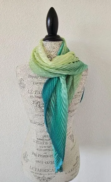 Pleated Sheer Green Ombre Green Scarf 62" x 22" Pleated ombré scarf, transitioning from a bright yellow-green to a deep teal or blue-green color. Style: Pleated, offering a textured and flowing appearance. Color: Ombré, with a gradient from light yellow-green to dark teal/blue-green. Material: Likely a lightweight and sheer fabric, such as chiffon or a synthetic blend, given the pleating and drape, no care tag. Potential Uses: Can be worn as a fashion accessory around the neck or shoulders, or potentially as a decorative element
