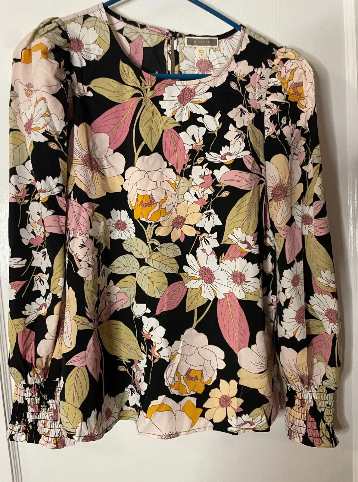 Measurements: • Pit to Pit: 19 in • Length (Shoulder to Hem): 24in Type: Blouse Department: Women Material: Polyester Blend Sleeve Type: Puff Sleeve Pattern: Floral Accents: Button Features: Stretch Fit: Regular Keywords: Pleione Blouse, Floral Top, Puff Sleeve, Smocked Cuffs, Women's Blouse, Black Floral Print, Long Sleeve Top, Boho Blouse, Feminine Top, Spring Fashion, Casual Top, Office Wear, Size Small Top, Patterned Blouse 69