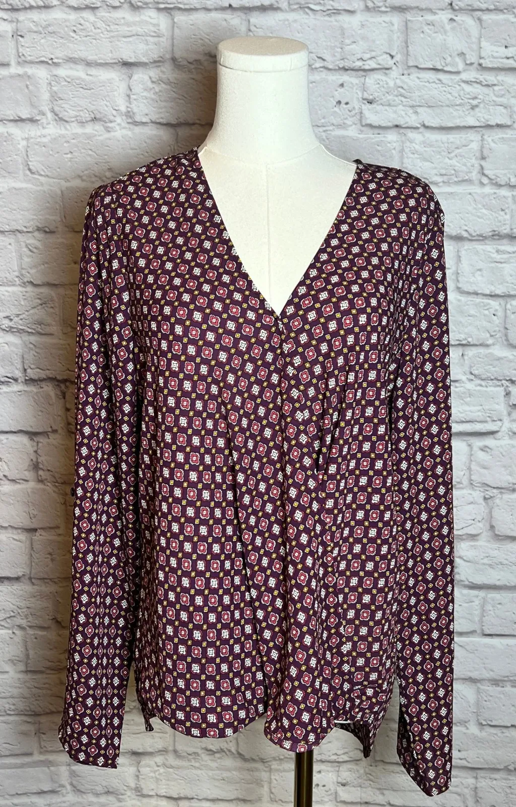 Pleione Women's M Purple Geo Print Hi-Low Hem Long Sleeve Blouse Plum purple long sleeve blouse with geometric print and V-neckline. Woven polyester fabric with hi-low hem and relaxed fit through the body. Long sleeves with straight cuffs. Brand: Pleione Size: Women's M Color: Plum / purple with multicolor geometric print Material: 100% Polyester Style: Hi-low hem blouse Measurements (laid flat): Pit to pit: 21" (42" bust) Sleeve length: 25" Length: 28" (back), longer in back due to hi-low hem Condition: NWOT, no flaws noted. Keywords: women's blouse, pleione top, purple blouse, hi low blouse, geometric print top, work blouse