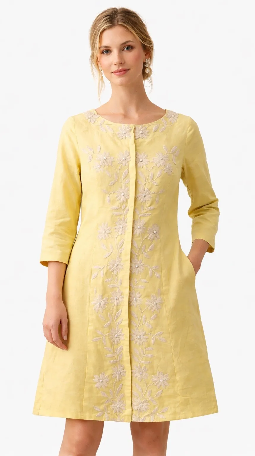 Soft pastel yellow cotton dress featuring intricate ivory floral embroidery down the front and back... Show more