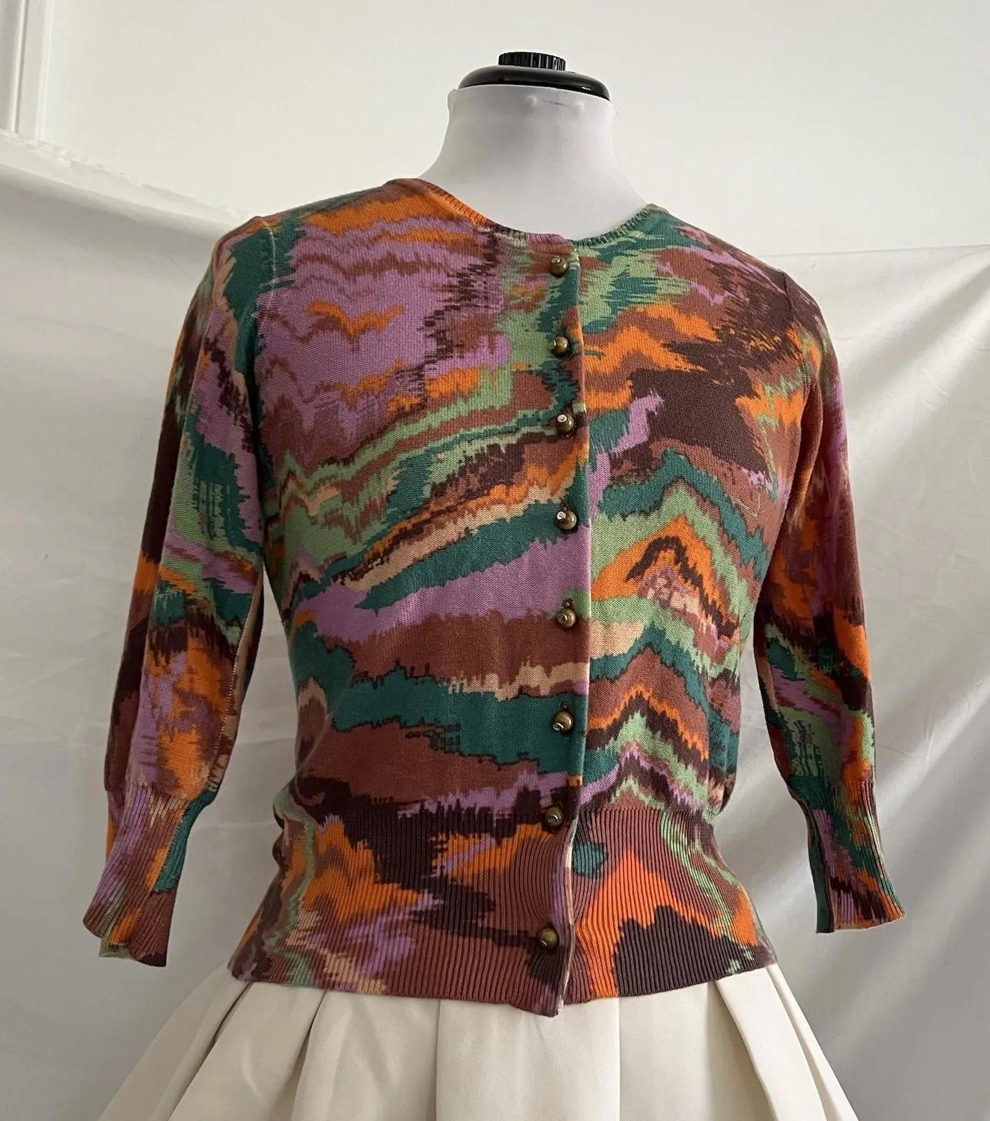 Excellent vintage condition. Inspect photos carefully. Measurements: Width ptp: 14" Length: 19" • Fiber Content: 100% Cotton—soft, breathable, and ideal for those who prefer natural fibers over wool. • Design: Intricate space-dye knit pattern with delicate bronze-tone buttons and a flattering ribbed waist/cuff. • Aesthetic: Boho, Indie, Anthropologie Style, Earthy, Artsy. Condition Pre-owned / Excellent Condition. Carefully inspected. No stains, holes, or significant pilling.