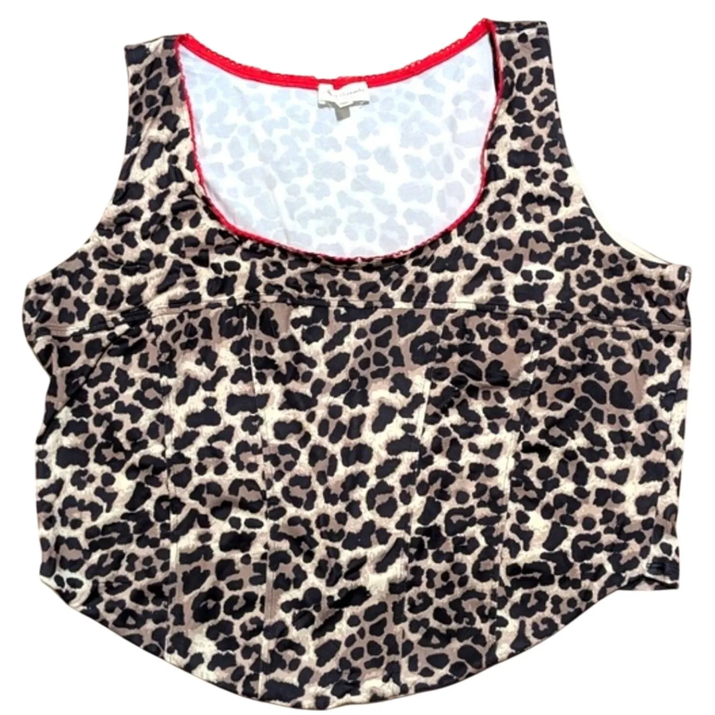 Make a bold statement with this stylish leopard print corset style crop tank top, highlighted by striking red accents. Scoop neck, longer in front than back, sexy animal print, retro look! Brand new with tags in women's plus size 3X! bust 48-54" length 24" in front, 19.5" in back