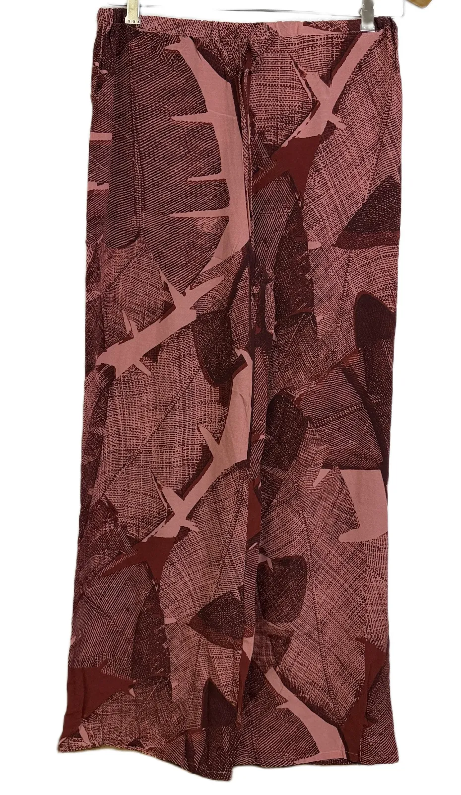 This listing is for a pair of Poetry Women's Floral Wide Leg Pants. Burgundy/Pink. Elastic waist / drawstring closure. Viscose. Condition, Excellent Approx Measurements Tag Size, 8 Waist, 12.5in Front Rise, 12in Inseam, 30 in Leg Opening, 12in
