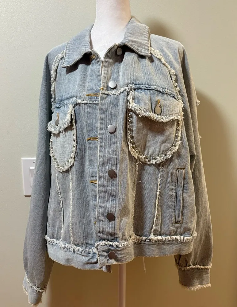 Fun light wash distressed denim jacket with sequenced American flag patch in the back. Tagged as sma... Show more