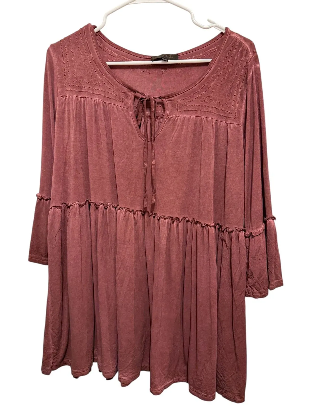 Discover effortless charm in this dusty rose tunic top. A flattering tie neckline and intricate embr... Show more