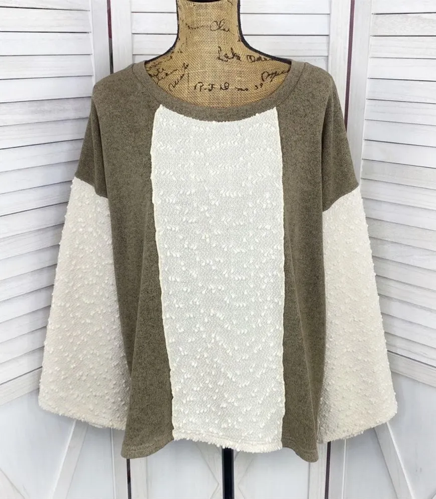 POL Open Tie Back Bell Sleeve Color Block Sweater Size Large Mocha brown with cream color blockin... Show more