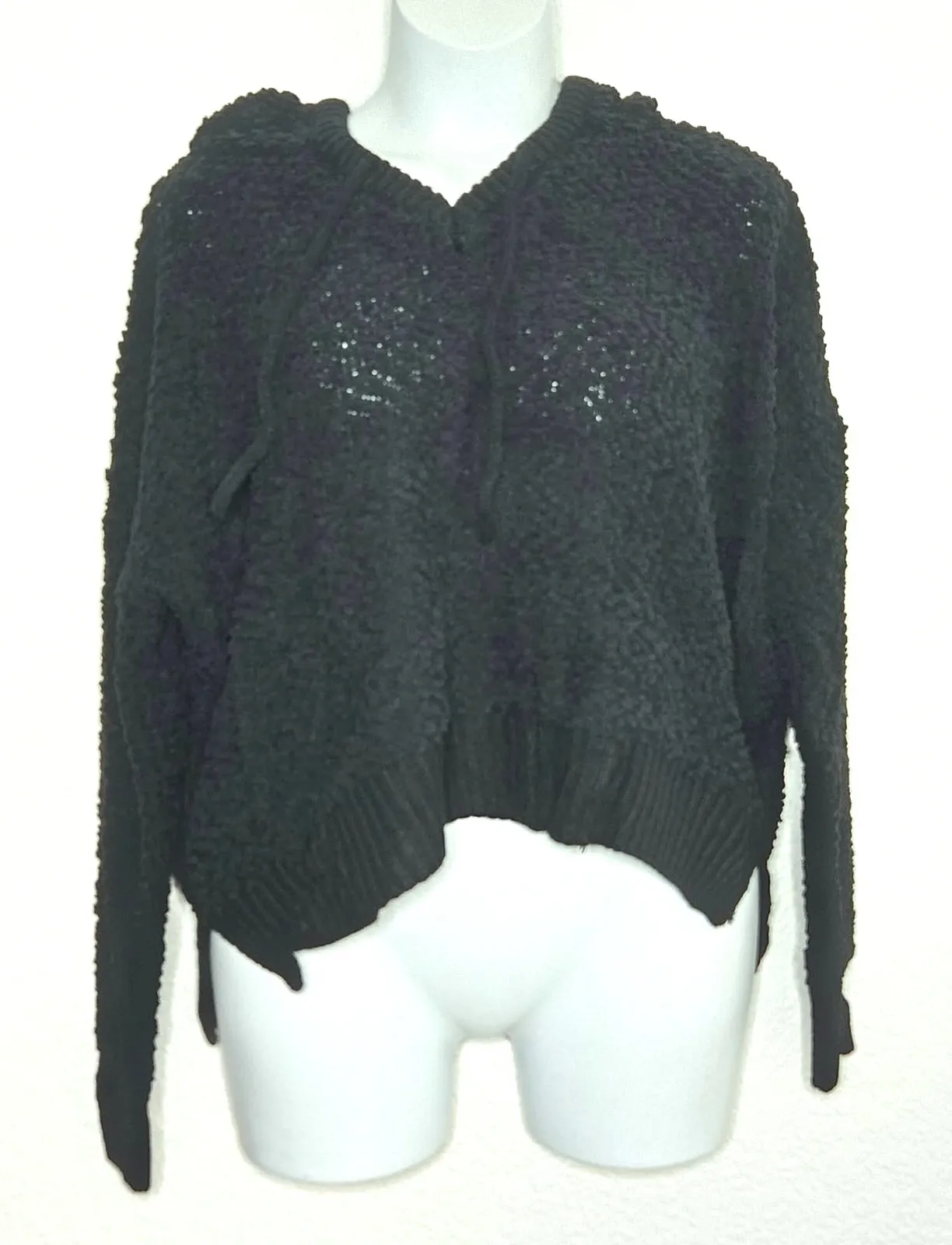 Relaxed oversized fit. Sweater features a V-neckline, a hood with an adjustable tie, a knitted weav... Show more