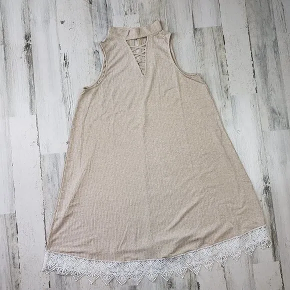 Polagram Oatmeal High Neck Sleeveless Lace Dress Size Large Shift style mini dress High mock choker... Show more