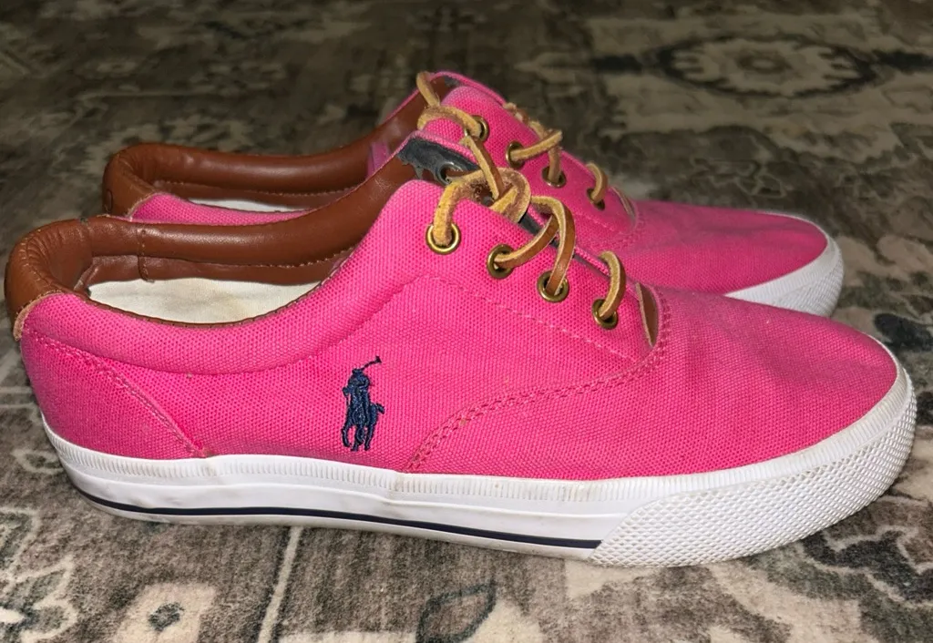 Stylish pink sneakers with brown accents. Features iconic logo. Comfortable and trendy.