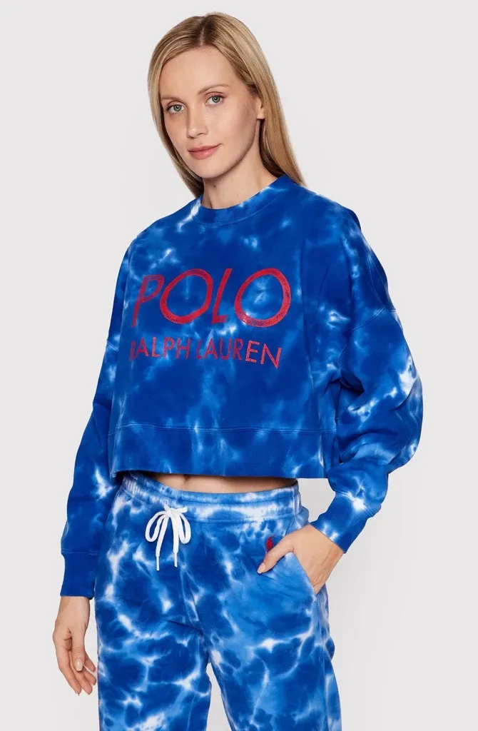 Bold blue tie-dye crewneck with striking red logo. Perfect for a trendy look and slightly oversized