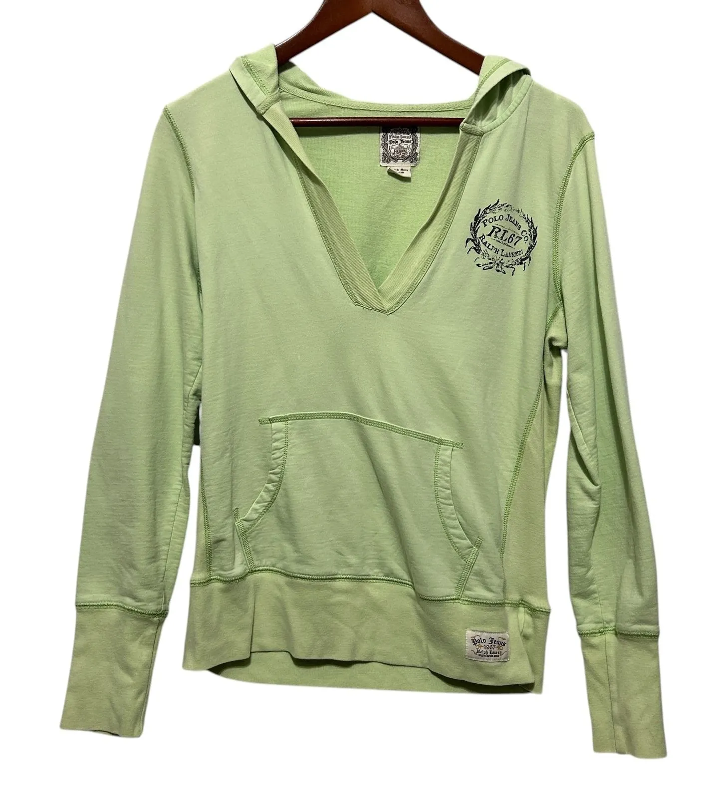 Polo Jeans Womens Y2K Hoodie M Green V Neck Kangaroo Pocket Casual Streetwear Features: • cotton knit with smooth lightweight feel, machine wash • solid light green with front crest graphic detail • hooded design with kangaroo pocket • good preowned condition Style Profile: casual streetwear, retro sporty, early 2000s, weekend wear, cozy layering, campus style Approximate Measurements: flat lay: armpit to armpit: 22" length: 25" Pet/smoke free home 1-2 day shipping Bundle & Save